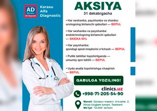 Siz uchun saralab, klinikaga albatta borishga arzirlі aksiya topdik. Vaqt o‘tkazmay — siz bilan bo‘lishyapmiz!