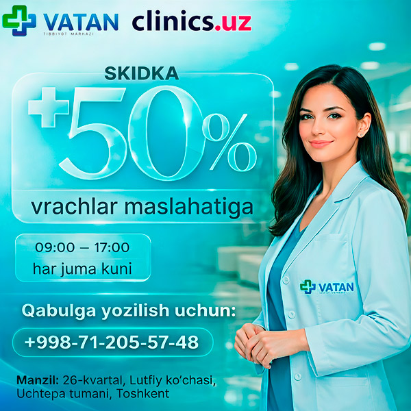 SKIDKA 50% shifokorlar konsultatsiyasiga — har juma kunlari Vatan tibbiyot markazida!